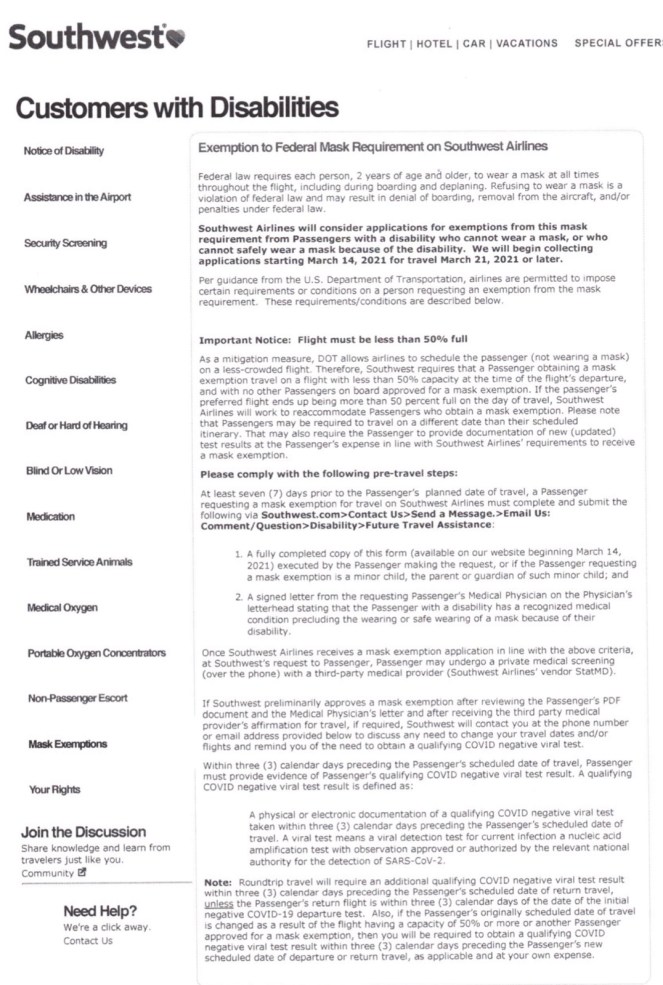 My favorite thing is the fact that when passengers need to eat, their masks are allowed to come off. I guess while you eat Covid doesn’t leave you because it knows you’re eating food. Really Southwest air! If that is the case, you should have no food service on your airlines because you’re saying that federal law states you cannot be unmasked on their planes. Oh by the way, it isn’t a law. It has not gone through the courts to become a law. All this airline is doing is discriminating against a whole group of people with developmental disabilities. The best part, is you can only have one person on the flight that is exempt from wearing the mask. I guess if you have twins or more than one child with the disability, you have to take separate flights. I’m sorry, but whoever wrote this up and made these rules, is one incompetent buffoon! What Southwest did to my friends is against the law!